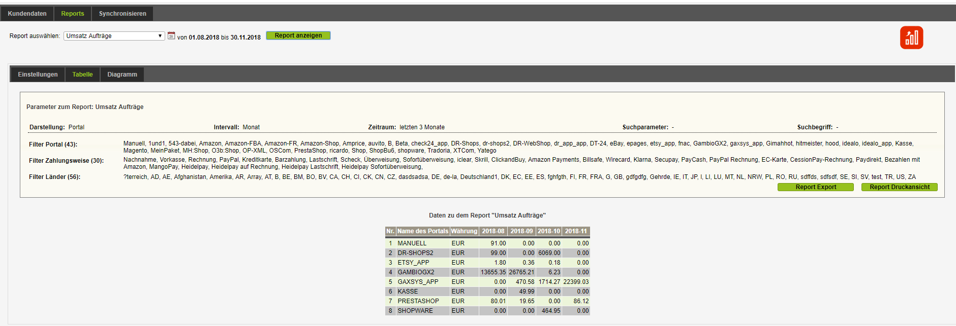 Du kannst einen Filter setzen, der die Parameter Portal, Land sowie Zahlungsweise einschränkt. Über die Schaltfläche "Report anzeigen" oder das Kreispfeil-Icon kannst du den Report nach deinen Änderungen neu erstellen.